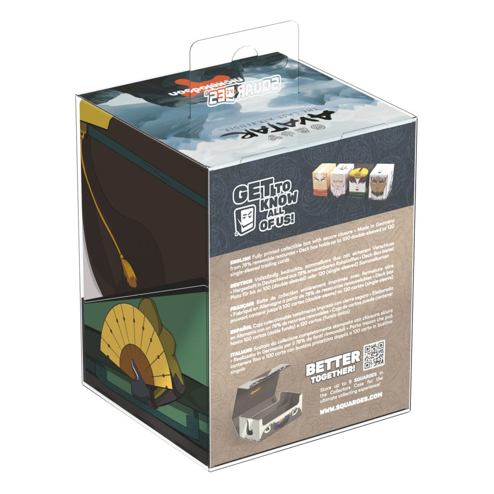 Sammelbare Box zur Aufbewahrung von TCG-Decks, Tabletop-Zubehör und/oder Sammlerstücken. Der Avatar Kyoshi Squaroe aus der Avatar: The Last Airbender-Edition bietet als Deck-Box benutzt Platz für bis zu 100 Spielkarten in doppelter Schutzhülle. Squaroes werden aus 78% erneuerbaren Rohstoffen hergestellt und passen perfekt in das separat erhältliche Collectors Case.