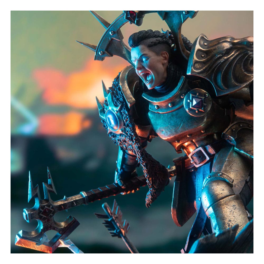 Zum Videospiel "Warhammer: Age of Sigmar" kommt diese großartige Statue aus hochwertigem Polystone. Sie ist ca. 34 cm x 40 cm x 39 cm groß und wird mit Austauschteilen geliefert, darunter ein Helm mit LED-Beleuchtung. Features: - Limitierte Auflage von 650 Stück; - Maßstab 1:6; - Hauptsächlich aus Polystone gefertigt; - Digital modelliert von den Künstlern Daniel Cockersell und Victor Gully von Weta Workshop; - Dynamische Pose zeigt Neave mitten im Sprint, wie sie von einer zerschmetterten Orruk-Kriegsplattform springt; - Bewaffnet mit ihren Äxten, die vor Sturmblitzen knistern; - Die Rüstung glänzt mit dem kampferprobten Glanz von Sigmars auserwählter Attentäterin; - Die Szene wird durch einen zertrümmerten Orruk-Helm und in der Erde steckende Pfeile vervollständigt.